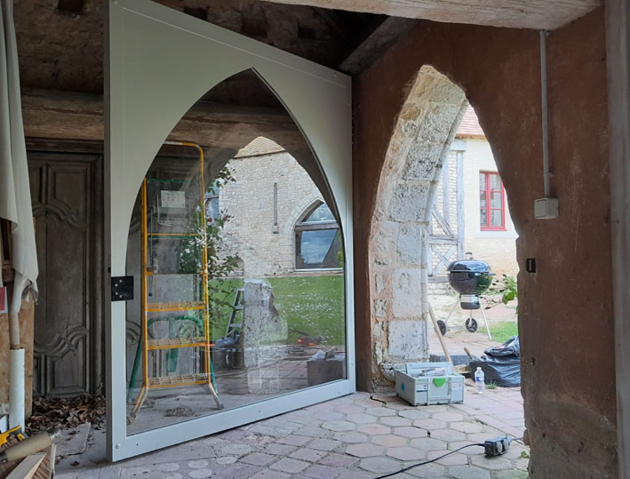 Projet de portes vitrée en arc brisé, cinq baies fixes et une baie ouvrante